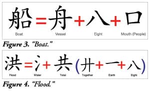 In the Chinese language, the character for “boat” is made of characters that reference “8 people in a boat”. The character for “boat,” 船, is composed of three characters. 舟 means vessel, 八 means 8, and 口 means mouth or person. Noah, his wife, his three sons, and each of their wives made eight people, and they were on the Ark. Image below.